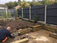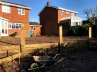 Railway sleeper wall set into concrete and a level garden. All ready for the hardcore.