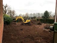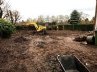 Here comes the digger!! We created a large flat area by digging out the bottom of the garden and putting a railway sleeper retaining wall in.